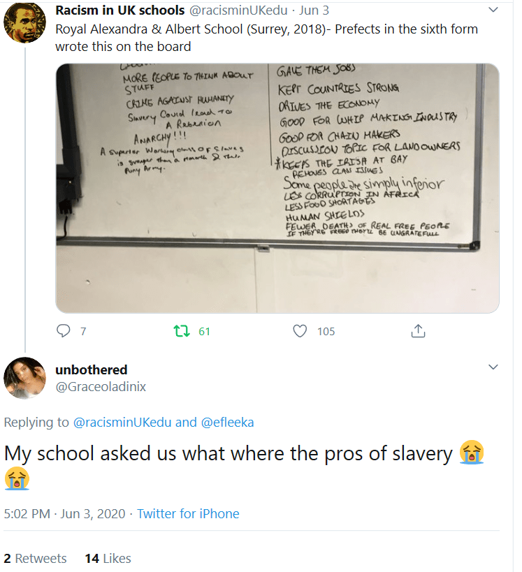 This is well needed in the UK today. As Haitian theorist Michel-Rolph Trouillot said of the role of power in the histories we remember, its ultimate mark is its invisibility. The last few weeks have removed some of their invisibility cloaks. Indeed the irony is that their removal has made them so much more visible. A nationwide, honest and awkward conversation about the principles required in teaching Slavery and Empire are beginning to expose some roots that remain hidden decades after the introduction of these topics into the history classroom. That process may well be uncomfortable for the vast majority of history teachers who are White. It should be.