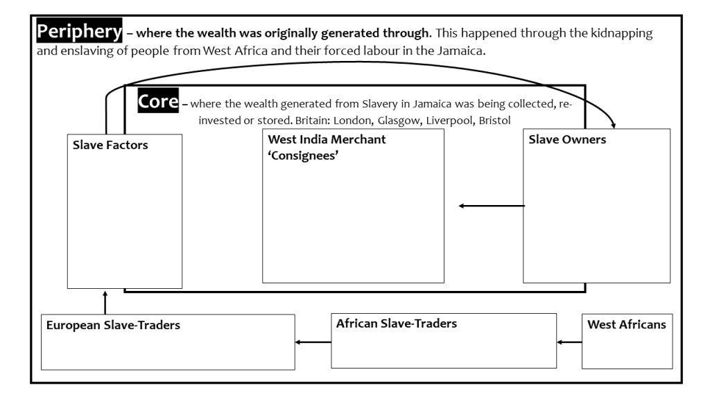 This diagram seeks to move away from the Triangular Trade model (discredited by the literature) and move towards a ‘core-periphery’ model that places the extraction of profit from the enslaved worker at it’s foundation. This diagram – alongside the explainer slide – should allow students the various ways to get rich off the back of enslaving West Africans and their descendants.