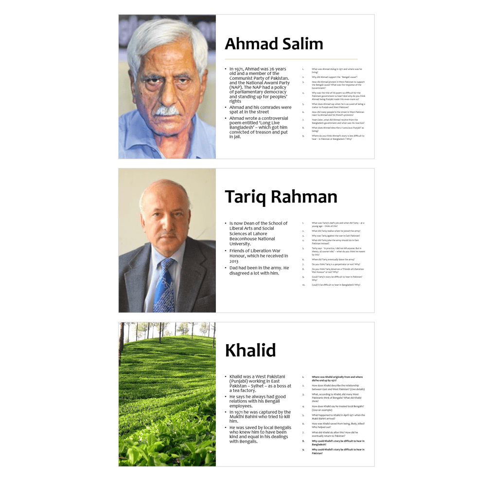 Having recapped the opposing state narratives analysed in lesson one, and considered in lesson two, students are now invited to learn about three more individual stories of people who lived through the events. Ahmad – a West Pakistani communist who supported East Pakistani independence efforts disturbs ‘official stories’ – told in Pakistan of a West Pakistani public that were wholly against Bangladeshi independence. In similar ways Khalid – a West Pakistani businessman in East Pakistan who is sympathetic to their plight – disrupts official stories told in both countries. The case of Tariq is even more complicated – a member of the West Pakistani army who stayed as a member during the war and afterwards but was heavily critical of his country’s actions. Lesson three therefore brings up not only the conflict between oral histories and state narratives, but questions of culpability and guilt during the war and genocide.