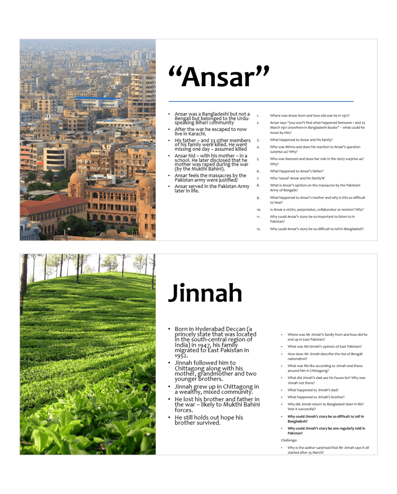 Inspired by Anam Zakaria in her brilliant book 1971, students are encouraged to examine the state narratives offered – by both Pakistan and Bangladesh – of the lead up to the events of 1971 and its aftermath – comparing them with the narratives offered by those who experienced it first hand.