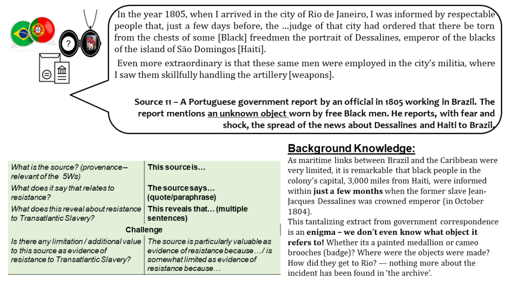 But with a clear enquiry focus set out over a series of lessons and reading as a class, students were able to, as Geggus does, ‘push at the edge of the case file’. They made inferences from the source about the electrifying effect the Haitian Revolution had on the whole edifice of Transatlantic Slavery. The unnamed official reports, with a more than a hint of fear, that Black ‘freedmen… with artillery’ were wearing a brooch or medallion on them that portrayed leader of the Haitian Revolution (referred to here as ’emperor of the blacks’). This in a slave society – Brazil – that shared limited trade relations with St Domingue or the French West Indies. We can only speculate how news traveled and what stories Black communities (both free and unfree) and White communitites told of the developments in Haiti. Geggus himself refers to the source as ‘tantalizing’…